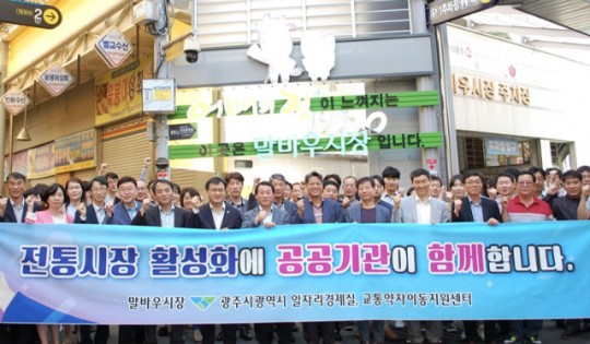 [한국검찰일보 오상택 기자]=광주시 일자리경제실과 교통약자이동지원센터는 지난 4월18일 공공기관과 전통시장 간 체결한 후원협약을 실천하기 위해 5월31일 말바우시장에서 합동 장보기와 협력실천 다짐행사를 개최했다.