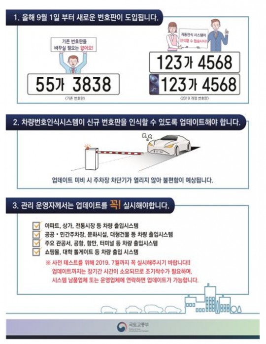 김영미 교통관리과장은 “새로운 자동차 번호판 발급에 따른 혼란이 야기되지 않도록 모든 대상시설물의 차량번호 인식시스템이 업데이트가 완료될 수 있도록 최선을 다할 것”이라며, “차량번호 인식시스템 관리주체는 신규 자동차 번호체계가 본격 시행되기 전에 업데이트를 서둘러 완료하여 주시길 바란다.”고 말했다.