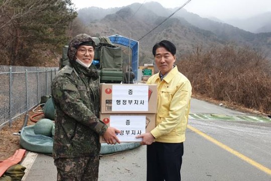 <김성호 행정부지사는 화천읍 인근 민통선 통제초소에서 군인들을 격려하고있다.사진=강원도 제공>