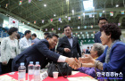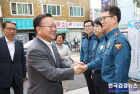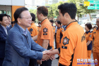 마포소방서 대원들과 인사하는 김부겸 장관 |