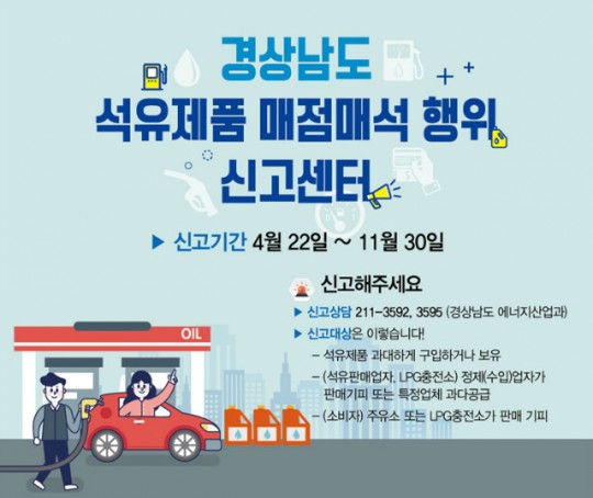 한편 천성봉 경상남도 산업혁신국장은 “매점매석행위로 인한 도민 불편사항이 발생하지 않도록 관련 기관 및 업체에 지속적으로 홍보할 예정이며, 도민들께서도 매점매석 위반행위 발견 시에는 도 신고센터(경상남도 에너지산업과)에 방문 또는 유선(055-211-3595)으로 신고해 주시기 바란다”고 밝혔다.