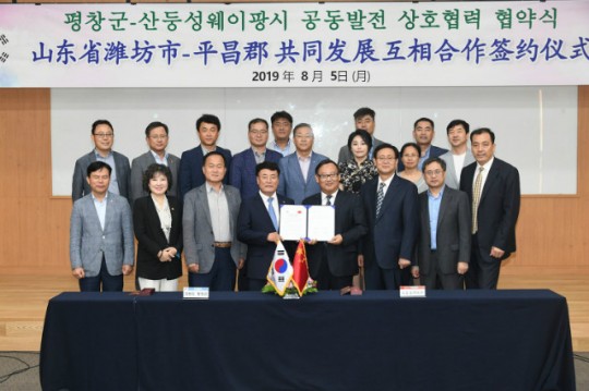 진유효 부시장을 단장으로 구성된 중국 산둥성 웨이팡시 대표단과 송기동 평창 부군수 및 관계자 등 21명이 참석한 가운데 경제, 교육, 농업 등 다양한 분야에서 공동발전을 위한 상호협력 협약을 체결했다.