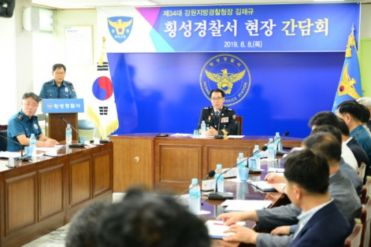 [한국검찰일보 유재석기자]= 김재규 강원지방경찰청장은 8. 8.(목) 10:00경 횡성경찰서(서장 탁기주)를 찾아 유공자에게 표창장 및 격려금을 전달하고, 현장 경찰들의 목소리를 듣는 간담회 시간을 갖었다.
