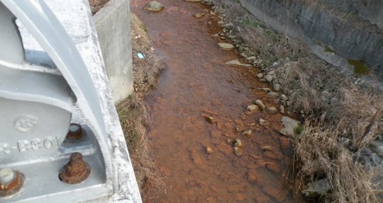 <정화 침전장을 통과 한 폐수 중금속이 정화되지 않은 채 하천으로 방류되고 있다>